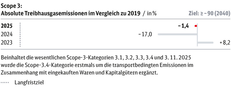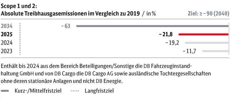 Im Zuge der im Beschluss zum Klimaschutzziel 2040 vorgesehenen regelmäßigen und 2025 erfolgten Revision unseres Klimaschutzziels haben wir unsere Treibhausgasreduktionspfade aktualisiert und mit den bei der SBTi eingereichten Zielen harmonisiert. Daraus resultierte eine Anpassung des Zwischenziels für 2034 für die Reduktion der Scope-1- und -2-Emissionen im Vergleich zum Vorjahr (im Vorjahr: 66 %). Für die Scope-3.4-Emissionen von DB Schenker wurde 2024 ein Zwischenziel festgelegt. Infolge des Verkaufs von DB Schenker ist der verbleibende Anteil der Scope-3.4-Emissionen des DB-Konzerns im Vergleich zu den anderen wesentlichen Scope-3-Kategorien sehr gering, sodass kein neues Zwischenziel definiert wurde.
