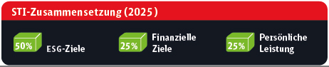- Darüber hinaus enthält auch die kurzfristige variable Vergütung (Short-term Incentive; STI) der Vorstandsmitglieder, leitenden Angestellten und weiteren Mitarbeitendengruppen (außertarifliche [AT-] und Tarifmitarbeitende) an den langfristigen Starke-Schiene-Zielen ausgerichtete Kennzahlen für eine nachhaltige Verkehrsverlagerung: Kundenzufriedenheit und Pünktlichkeit, Mitarbeitendenzufriedenheit sowie den Anteil erneuerbarer Energien am DB-Bahnstrommix. Zudem wird für die variable Vergütung der leitenden Angestellten und AT-Mitarbeitenden die persönliche Leistung als weitere Komponente berücksichtigt.