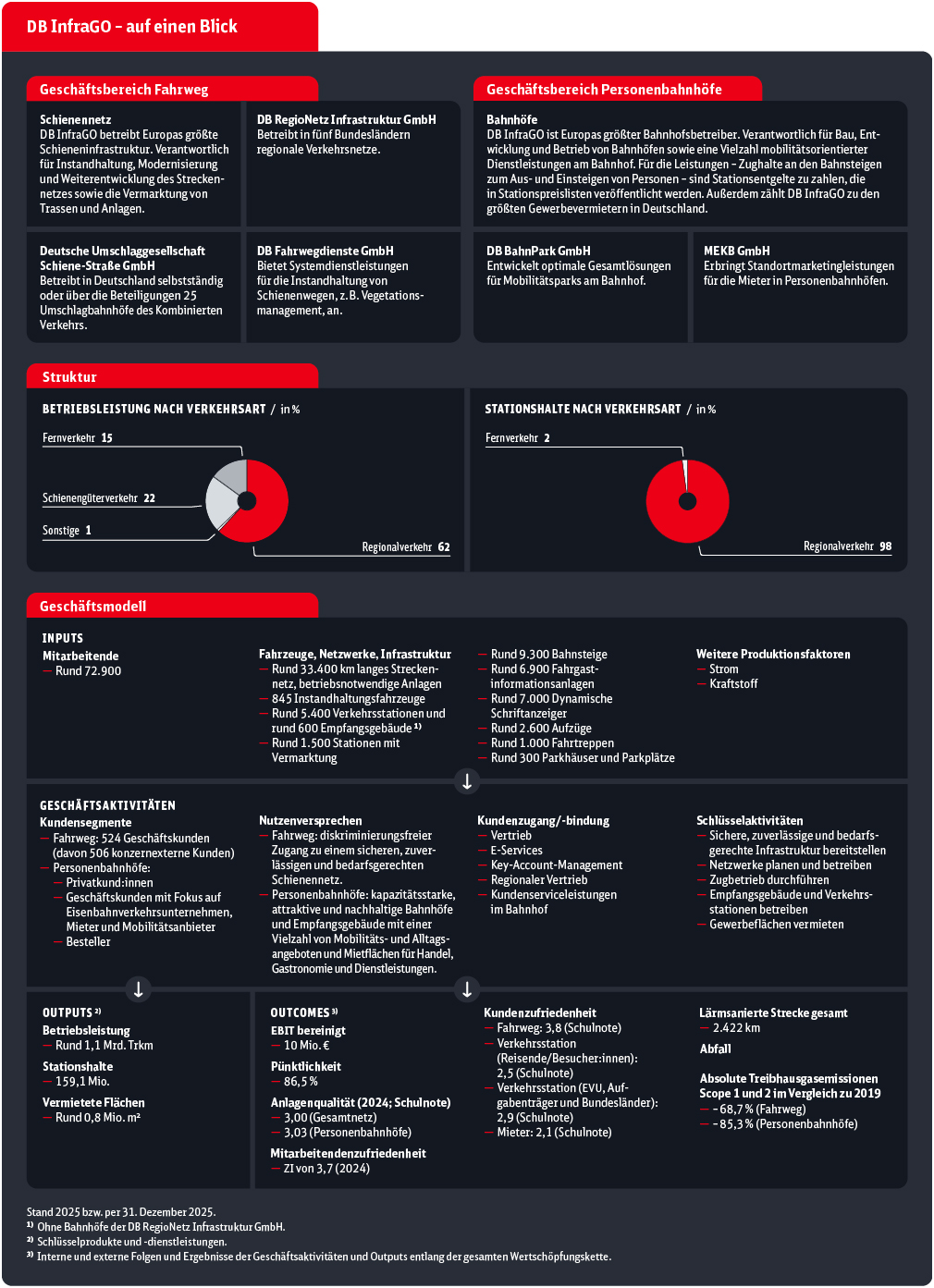 Dieser Unternehmenszweck wurde gemeinsam mit Vertreter:innen der Branche und der Politik erarbeitet. Das Leitbild drückt den Anspruch der Gesellschaft an DB InfraGO aus. Im Mittelpunkt stehen die fünf Dimensionen Leistungsstärke, Kundenorientierung, Gemeinwohlorientierung, Nachhaltigkeit und Teamgeist. Das Leitbild definiert außerdem ein gemeinsames Kundenverständnis für alle Bereiche von DB InfraGO und bildet damit die Grundlage für ein einheitlich ausgerichtetes Handeln im gesamten Geschäftsfeld. Die Nutzer des Bahnsystems – Reisende, Wirtschaft und Bahnhofsbesucher:innen – stehen im Fokus. Eine erfolgreiche Zugfahrt kann jedoch nur im Zusammenspiel mit den Geschäftspartnern gelingen: rund 400 Eisenbahnverkehrsunternehmen (EVU), 27 Aufgabenträger sowie rund 1.800 Infrastrukturanschließer und rund 2.100 Gewerbemieter in den Bahnhöfen. Ziel ist es, diese Partnerschaft durch gemeinsame Weiterentwicklung von Produkten und eine aktive Mitgestaltung der Zukunft des Systems Schiene zu stärken.